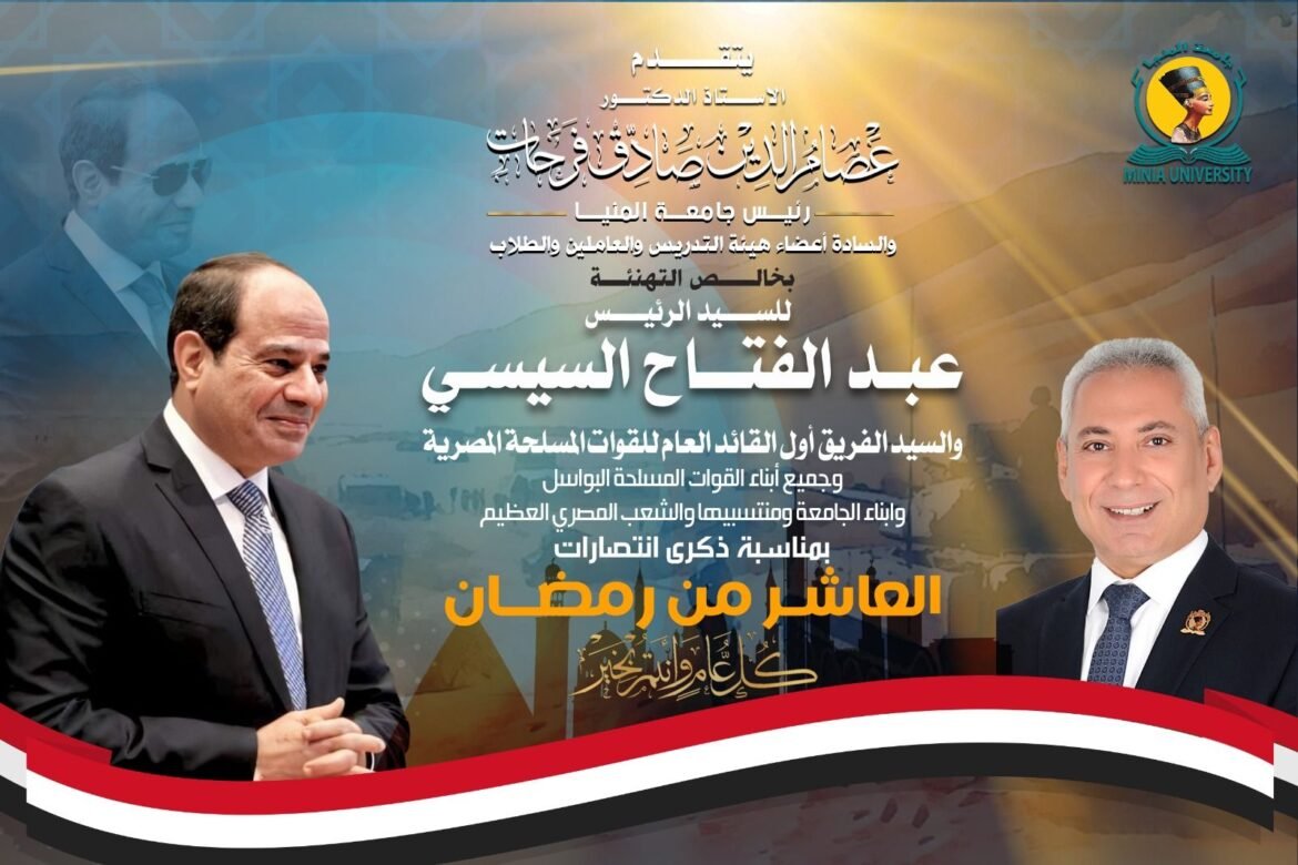 بعث الدكتور عصام فرحات رئيس جامعة المنيا برقية تهنئة للرئيس عبد الفتاح السيسي رئيس الجمهورية بمناسبة ذكرى الاحتفال بانتصارات العاشر من رمضان وتحقيق النصر علي الاعداء