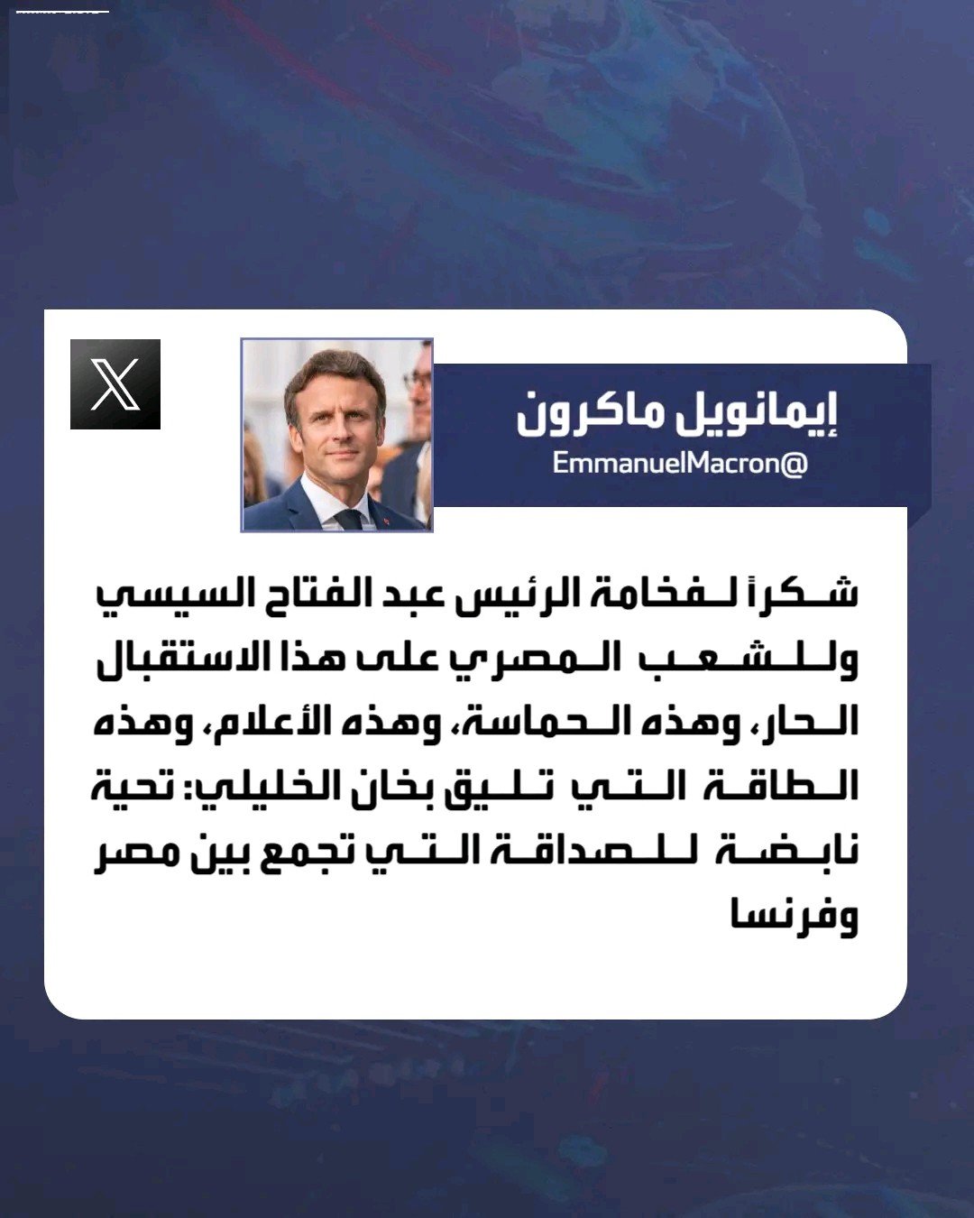 الرئيس الفرنسي إيمانويل ماكرون عبر “X”: “شكراً للرئيس السيسي وللشعب المصري على هذا الاستقبال الحار”